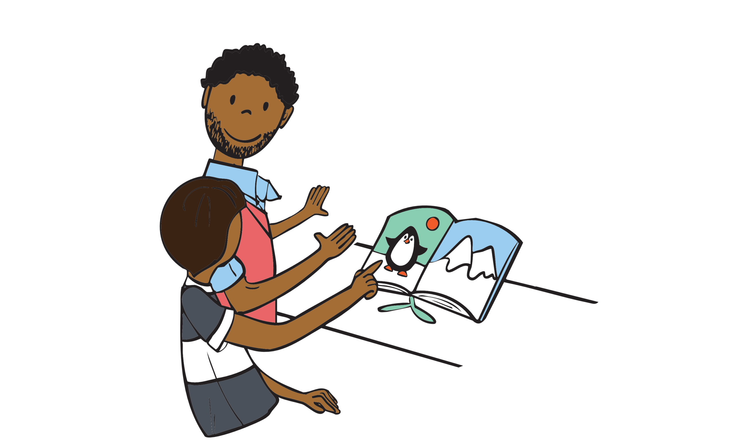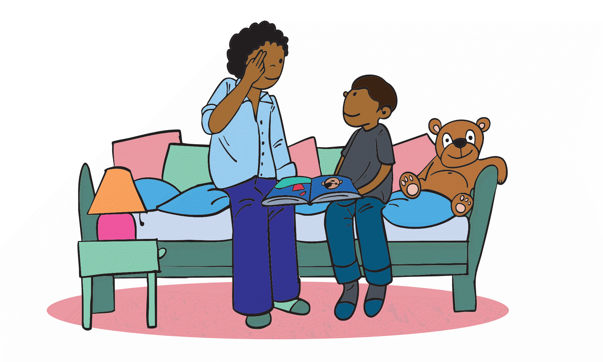 أو تَجْلِسَانِ سَوِيًّا عَلَى طَاوِلَةٍ، أَوْ عَلَى الأَرْضِ، أَوْ تَجْلِسَ أنْتَ جَانِبَ السَّرِيرِ. تَنْظُرَانِ سَوِيًّا فِي الْكِتَابِ. يُمْكِنُ لِطِفْلِكِ أَنْ يَنظُرَ إِلَيْكِ فِي أَيِّ وَقْتٍ.