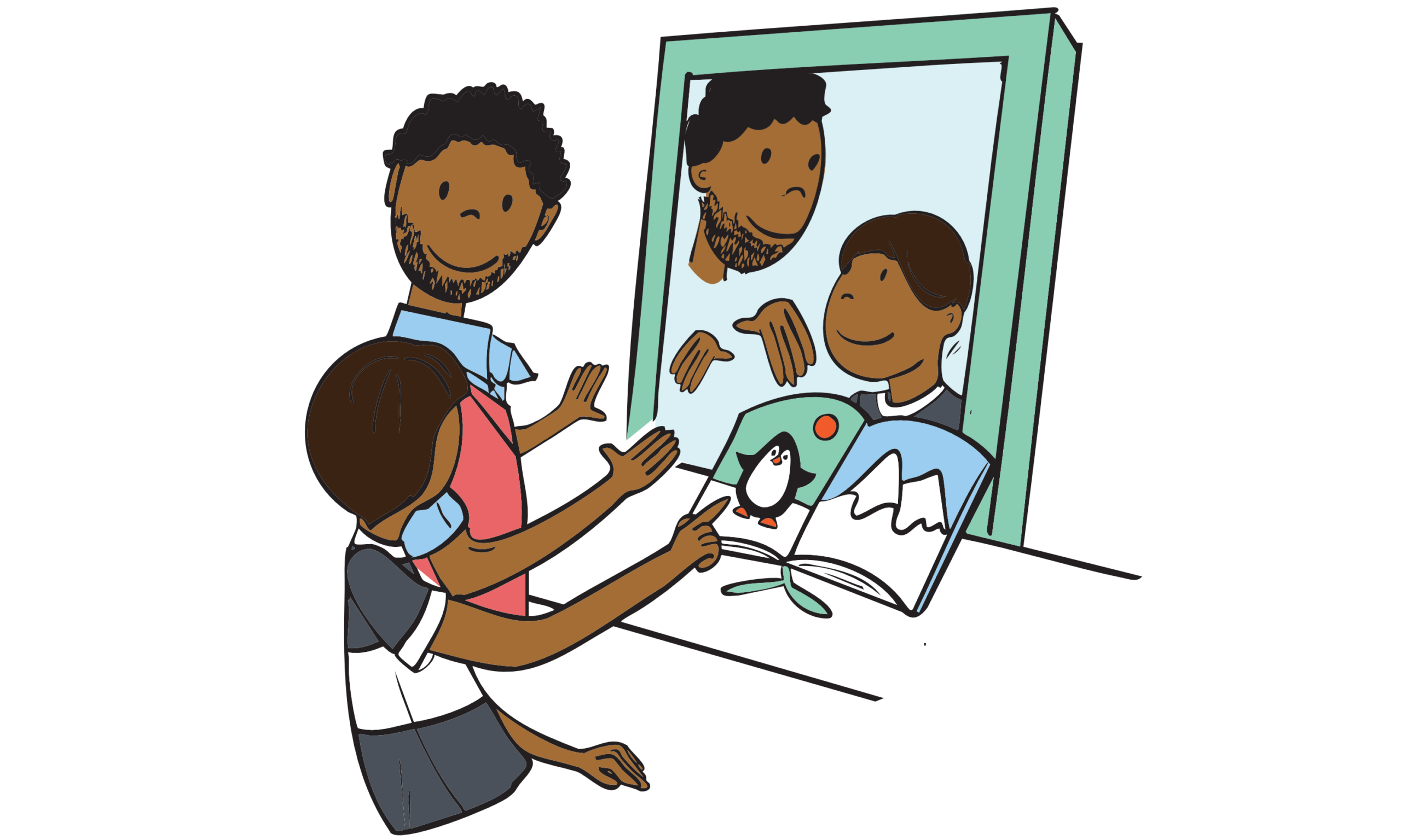 رَاقِبْ طِفْلَكَ عِندَمَا تَقْرَأُ لَهُ: هَلْ يَسْتَطِيعُ طِفْلُكَ رُؤْيَتَكَ وَرُؤْيَةَ الْكِتَابِ جَيِّدًا أَثْنَاءَ القِرَاءَةِ لَهُ وَيُحَوِّلُ النَّظَرَ بَيْنَكَ وَبَيْنَ الْكِتَابِ بِسُهُولَةٍ؟