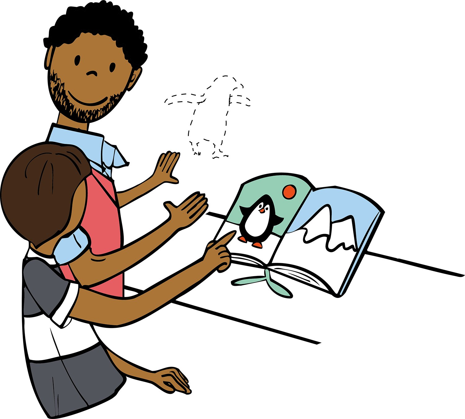 Ihr sitzt gemeinsam an einem Tisch, auf dem Boden oder du sitzt neben dem Bett. Ihr schaut gemeinsam in das Buch. Dein Kind kann dich auch jederzeit anschauen.