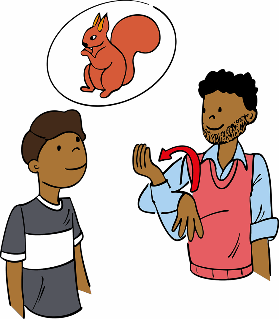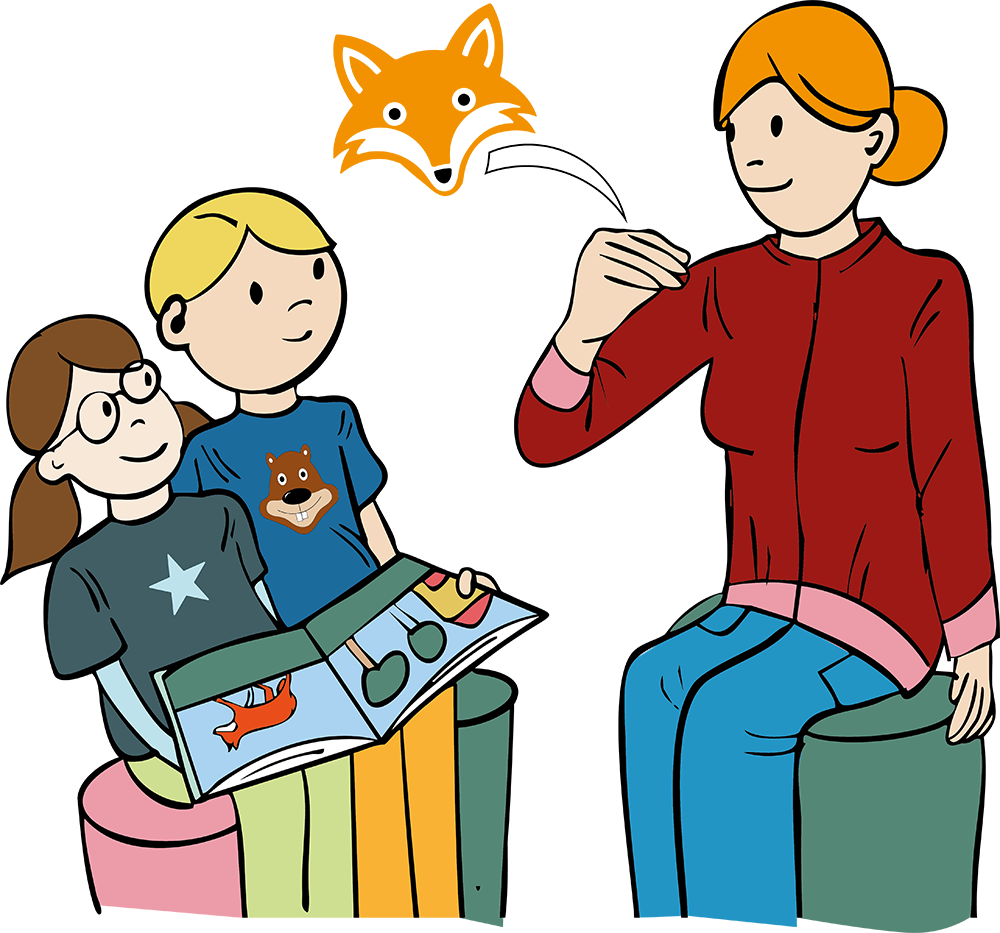 In sign language, you can use your facial expressions and your body as well as a larger sign language space. You can also involve your child: Ask your child, for example: “What is the crocodile doing?”